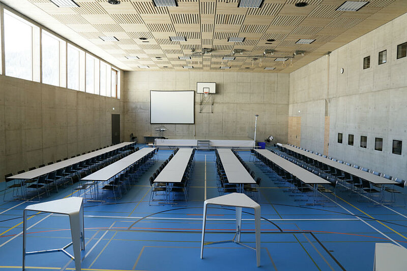 Für Veranstaltungen bietet die Halle für 420 Personen mit Stühlen und Tischen Platz.